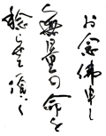 従って「月かげ」の詠は、お念仏を唱える前の偶文【如来(阿弥陀様)の光明は 遍く(あまねく)十方の世界を照らし 念佛の衆生を摂取して捨てたまわず】(阿弥陀様はお念仏する私たちを無限の光明で照らしてくださり、分け隔てなく平等に抱き取り、永遠にお育てくださる)とのお誓いを今一度お念仏裡に頂きたいと思います。 |
