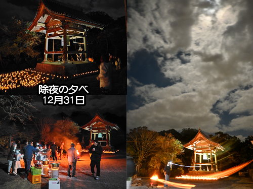 除夜の鐘は竹明かりの裡、約90名が参加、鐘を撞き終え、片付け、火の始末では防災ホースで消火、1時間後再度総ての安全確認したのが午前2時半、元旦は6時~7時修正会のお勤め念仏の後、おせちを頂いて暫し休息させて頂きました。